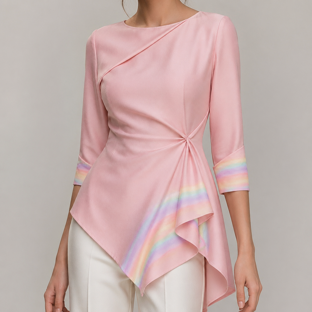 A Female Top design, in Elegant style. Pink Color with few rainbows, Three quarter sleeves, unusual cut. HR fashion aesthetics. Design with modest coverage.