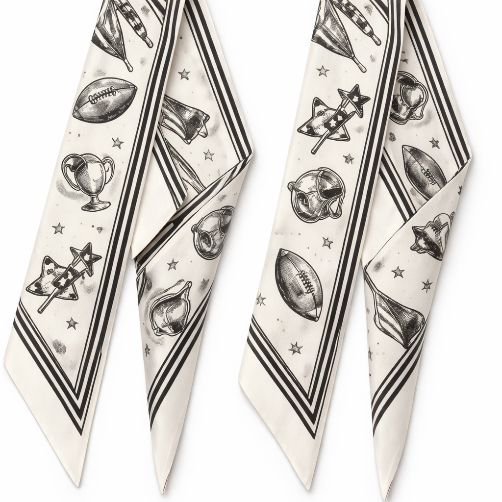 Design a silk scarf that is 5 x 86 cm with oblique edges. It will be wrapped around a handle of a handbag. That has a football vibe. No colors. Keep it vintage. No words or logos. All American and a lot more simple. Even more plain. Ralph Lauren looking. Make it feminine