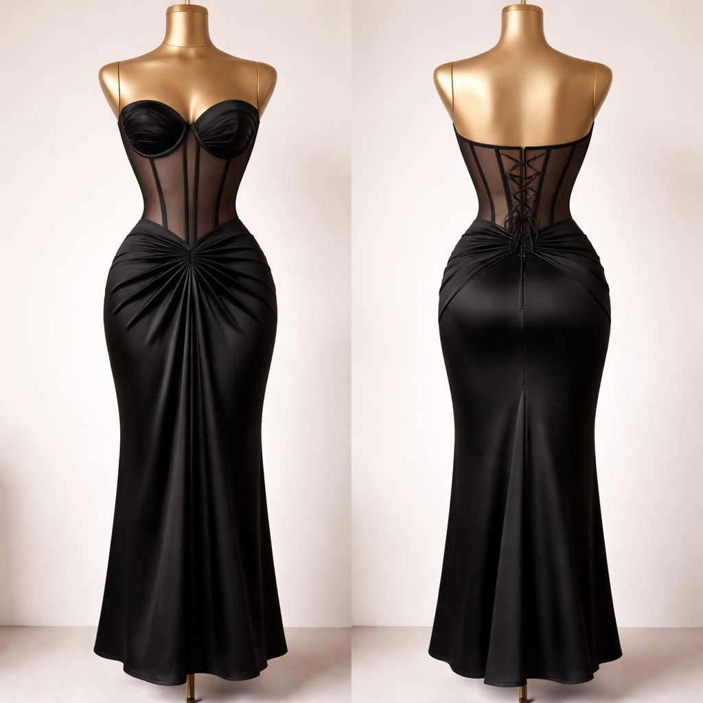 I have black silk fabric and sheer brown mesh net fabric. I am making an ankle length fitted gown with corset. The corset is in the sheer brown net fabric. The corset has black silk fabric along the line of the boning. The skirt of the dress is made out of black silk fabric. The bust of the corset is also black silk fabric. There are silk pleats on the cup of the corset and pleats on the skirt on the hips bringing it to the center in the middle of the skirt. Also, the skirt of the gown starts at the waist, not below the waist. The mannequin the dress is on is gold in color. , show front and back
