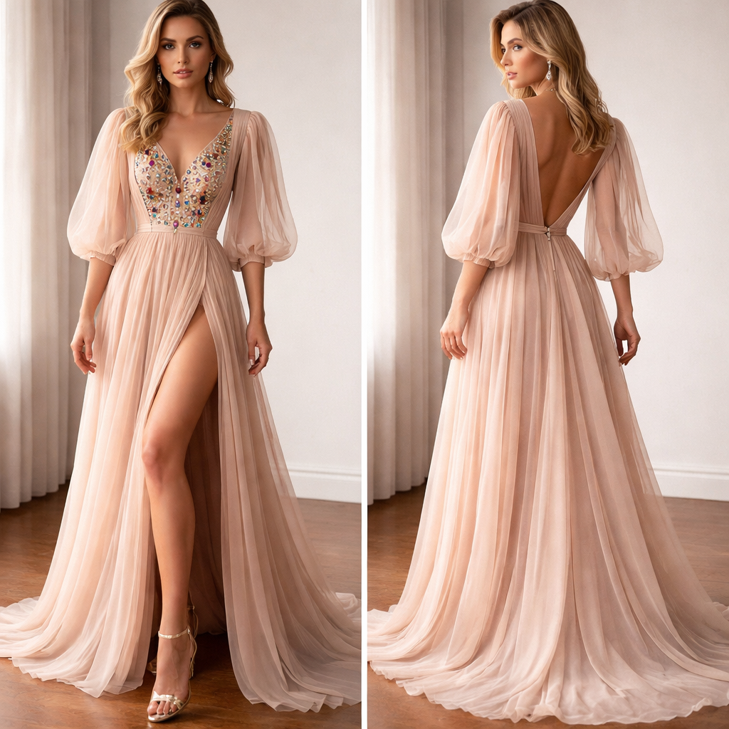 肉色雪纺面料,长裙,深V领,公主袖,左腿下方开叉到大腿,胸前镶嵌12个宝石像圣经中以弗得祭祀的衣服, formal style, show front and back