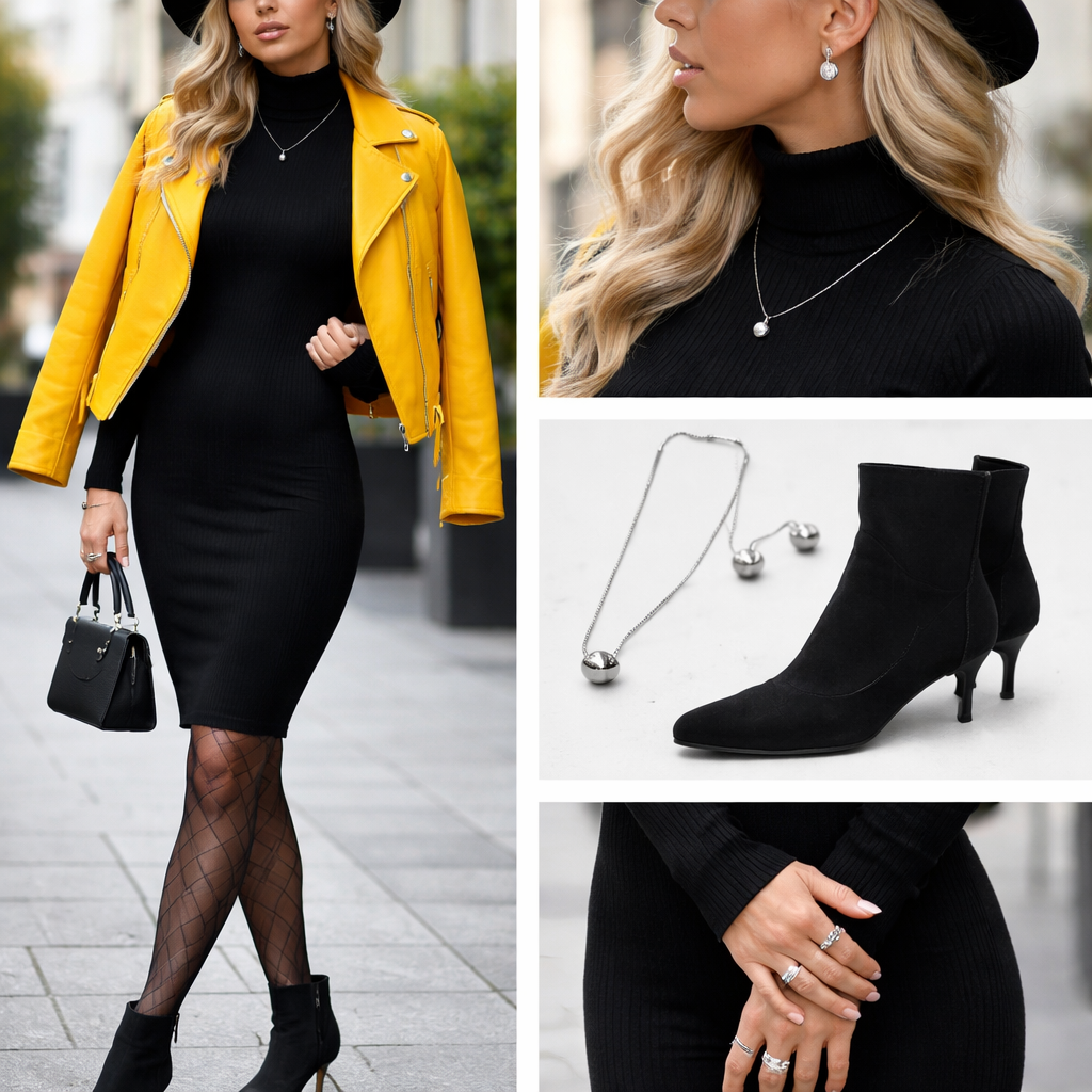 2. Black ribbed turtleneck knee-length dress - [ ] Black kitten booties - [ ] Yellow Moto jacket - [ ] Black small X-pattern plaid tights - [ ] Black fedora - [ ] Silver single ball necklace and single ball earrings set - [ ] Silver rings, artsy style