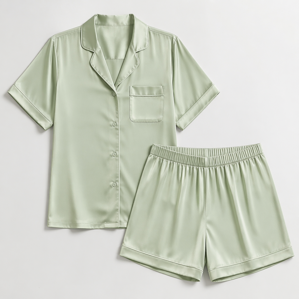 photorealistic fashion design, A Unisex Accessories design, in Casual style. Pyjamas, short sleeves+shorts, silky, everyday use, pastell green. Made for sleeping. Seamless, can absorb sweat easily, thin.. Sweden fashion aesthetics., casual style, just the design no text