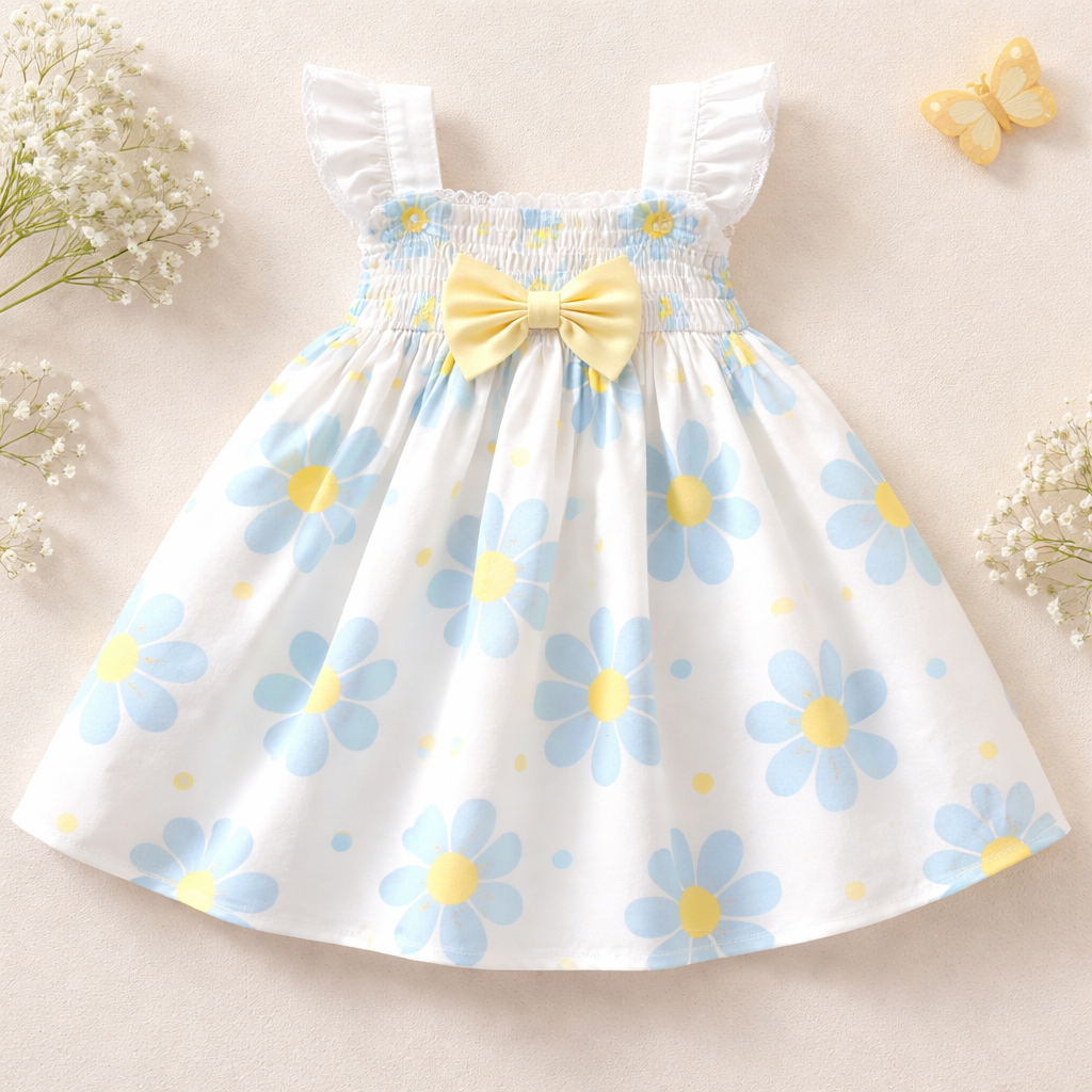 A baby girls dress with a solid white base with flowers on the slower petals pastel blue and the middle bit of the flower is pastel yellow and there is pastel yellow dots spreadaroundthe dress