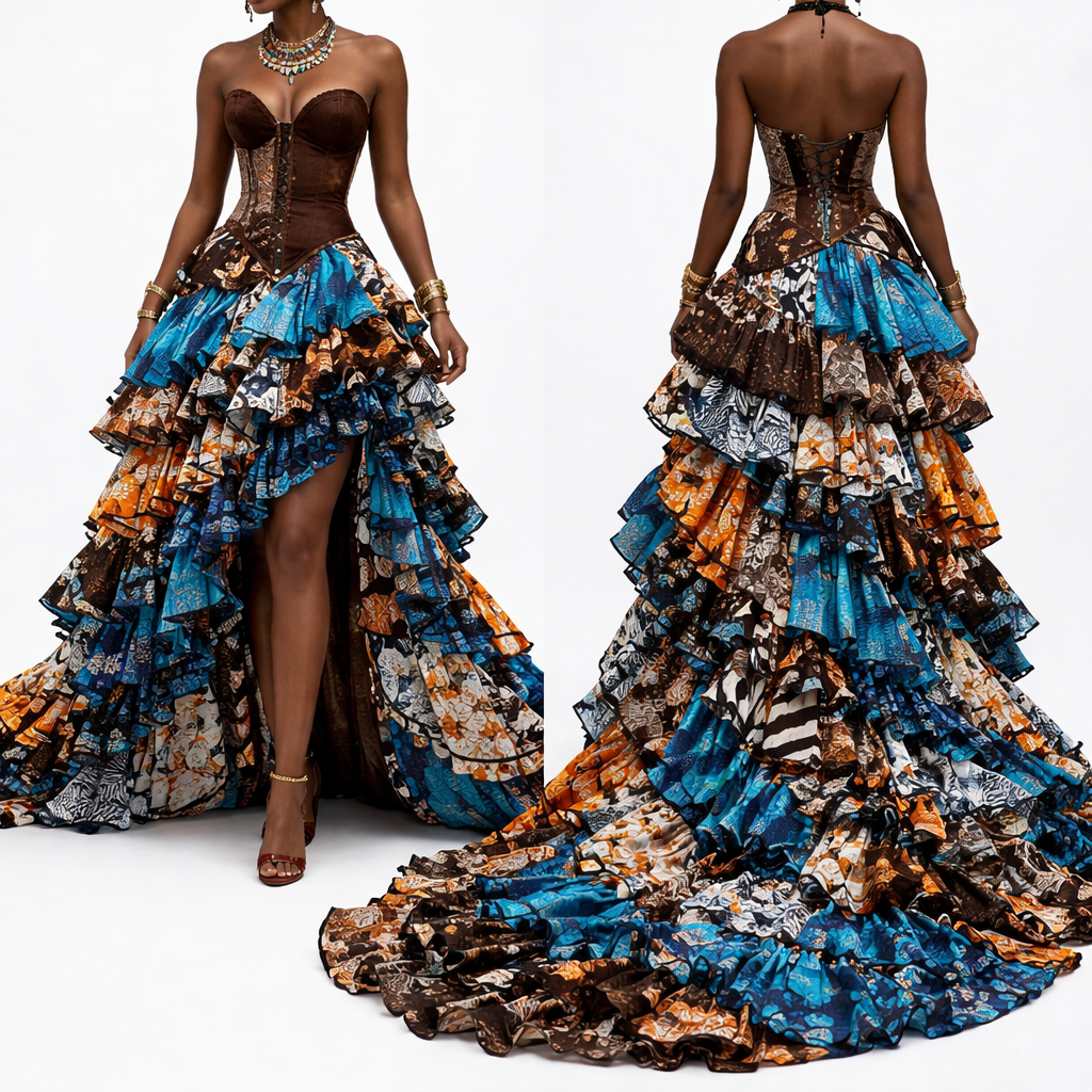 So it’s a traditional national Botswana costume The dress needs to have a long tail with different ruffles of different fabric prints called letace in different colors the top should be a corset in cow ski brown , show front and back