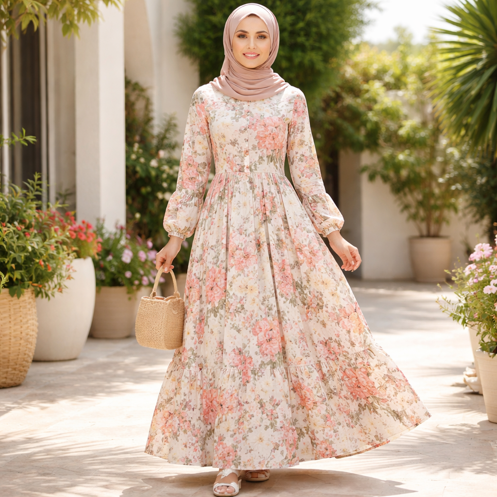 Flowery summer modest dress for hijabi women should be breathable but not see through