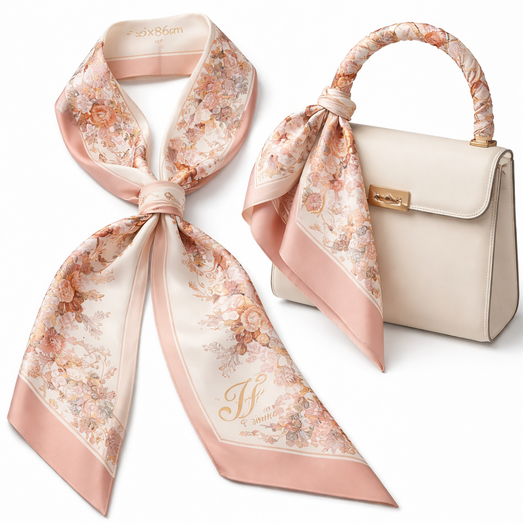Design a silk scarf thanks 5x 86cm to be wrapped on the handle of a purse. Symbols • Florals intertwined with geometric lines • Interlocking ribbons • Abstract crowns or halos (very subtle) • Flourishing monograms of JF or “JF Paris” style lettering Pattern approach • Delicate border + clean center stripe • When wrapped, florals peek through folds, classic style, show front and back