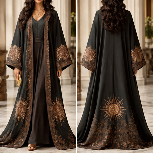 I want a open abaya/kaftan with bronze sun embiodery on end of sleeves and also the inner sides of the open kaftan facin...