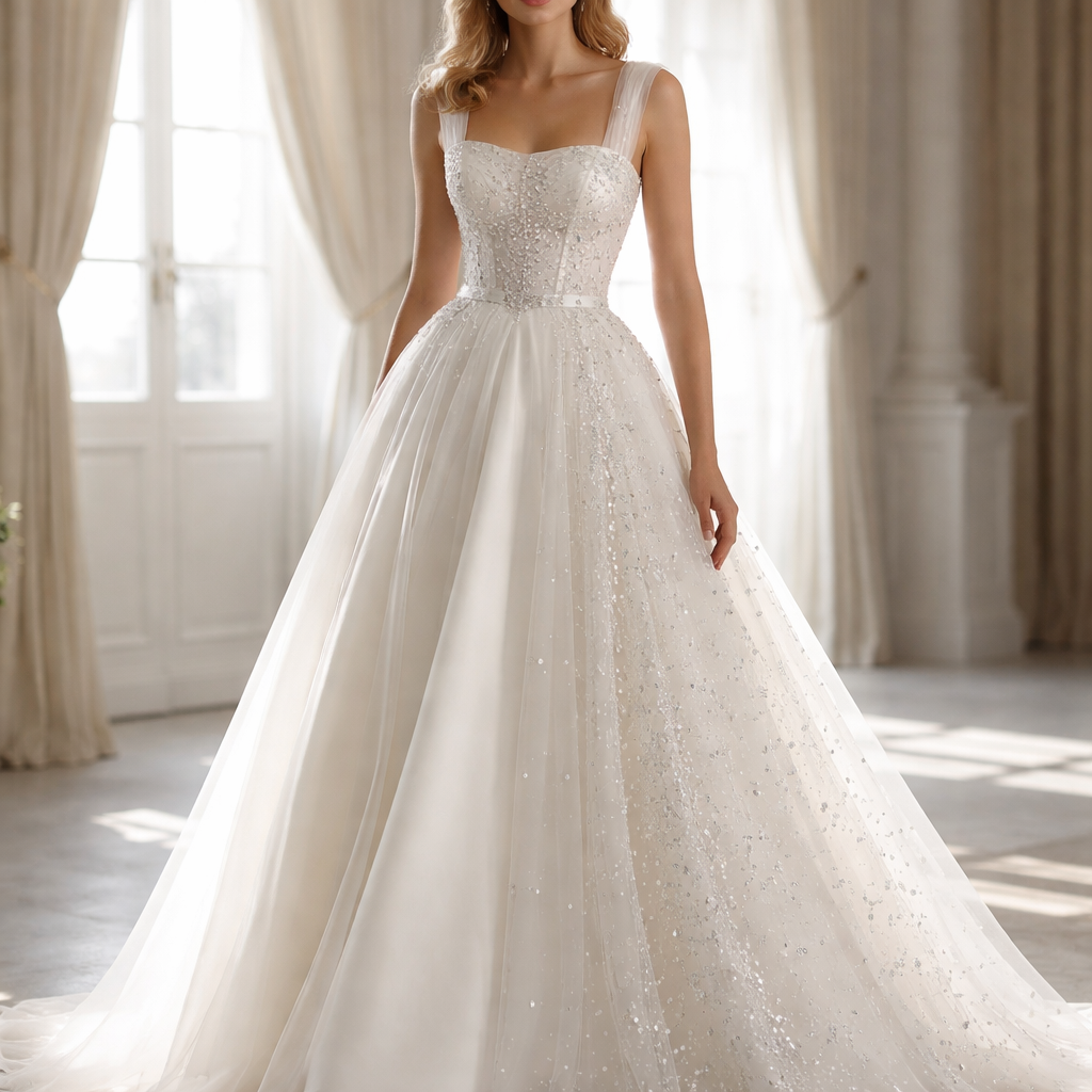 Wedding style dress. White. Size 14 UK. Corset bodice, silk with gauze overlay, studded with clusters of diamonds. Thick wide, medium folded sleeveless straps. Box shaped neck line. A-line skirt, silk, from under the bust to ankles. Thin second skirt of gauze, studded downwards diagonally with diamonds.