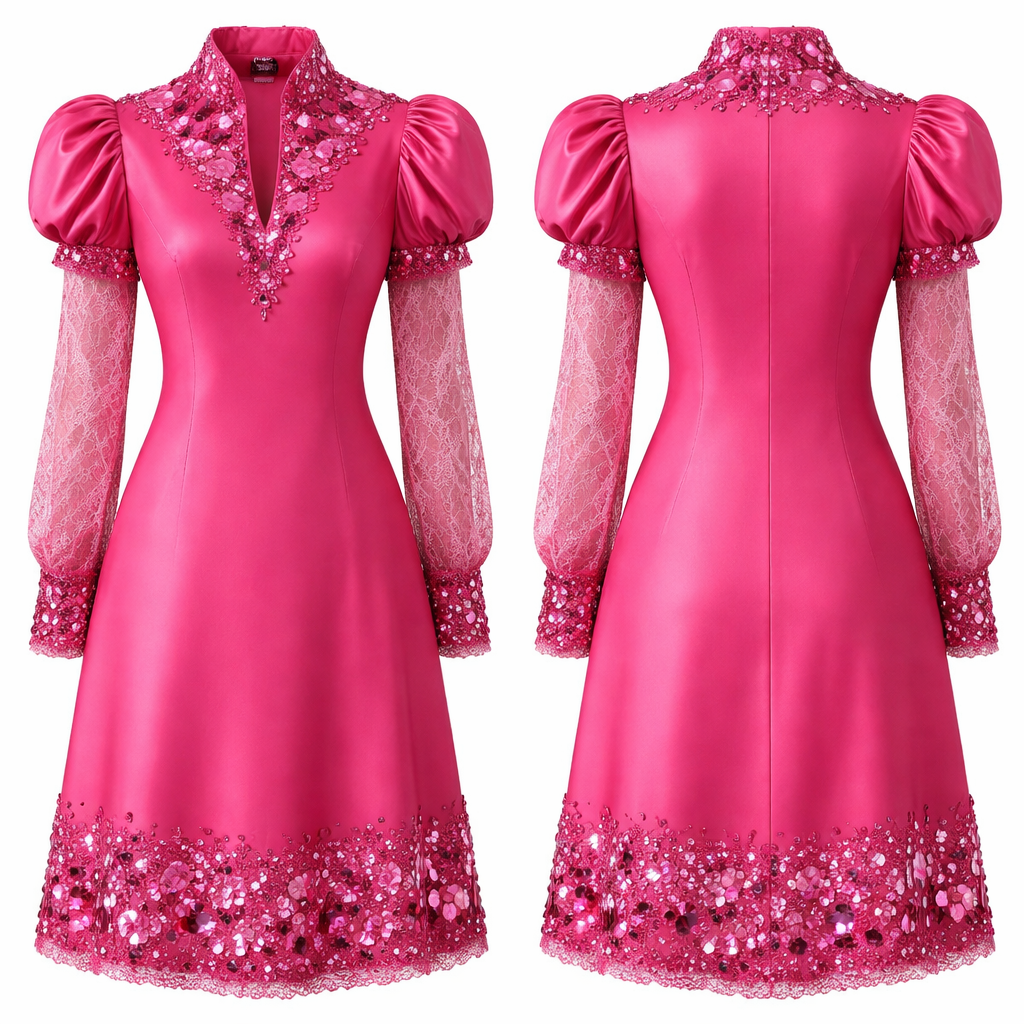 A knee length aline shift dress. Made from hot pink silk material with puffed cap sleeve and a bishop collar with a high v-neck line. The dress isn’t a ball dress but an A-lined dress. Hot pink large and medium size Sequins like that used in imadeduso design are used to design the end of sleeve and the end of the dress, also the neck area and the front to give it a glamorous look. There is also a lace long sleeve attached under the sleeve , glamorous style, show front and back