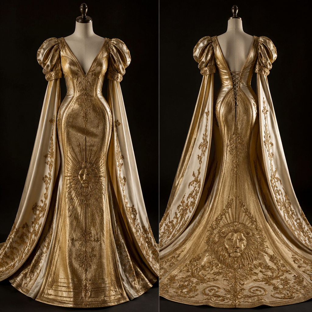 My fashion design embodies a vintage aesthetic inspired by the bold energy of the Leo zodiac sign, featuring gold as the primary color and emphasizing a dramatic, statement-making look