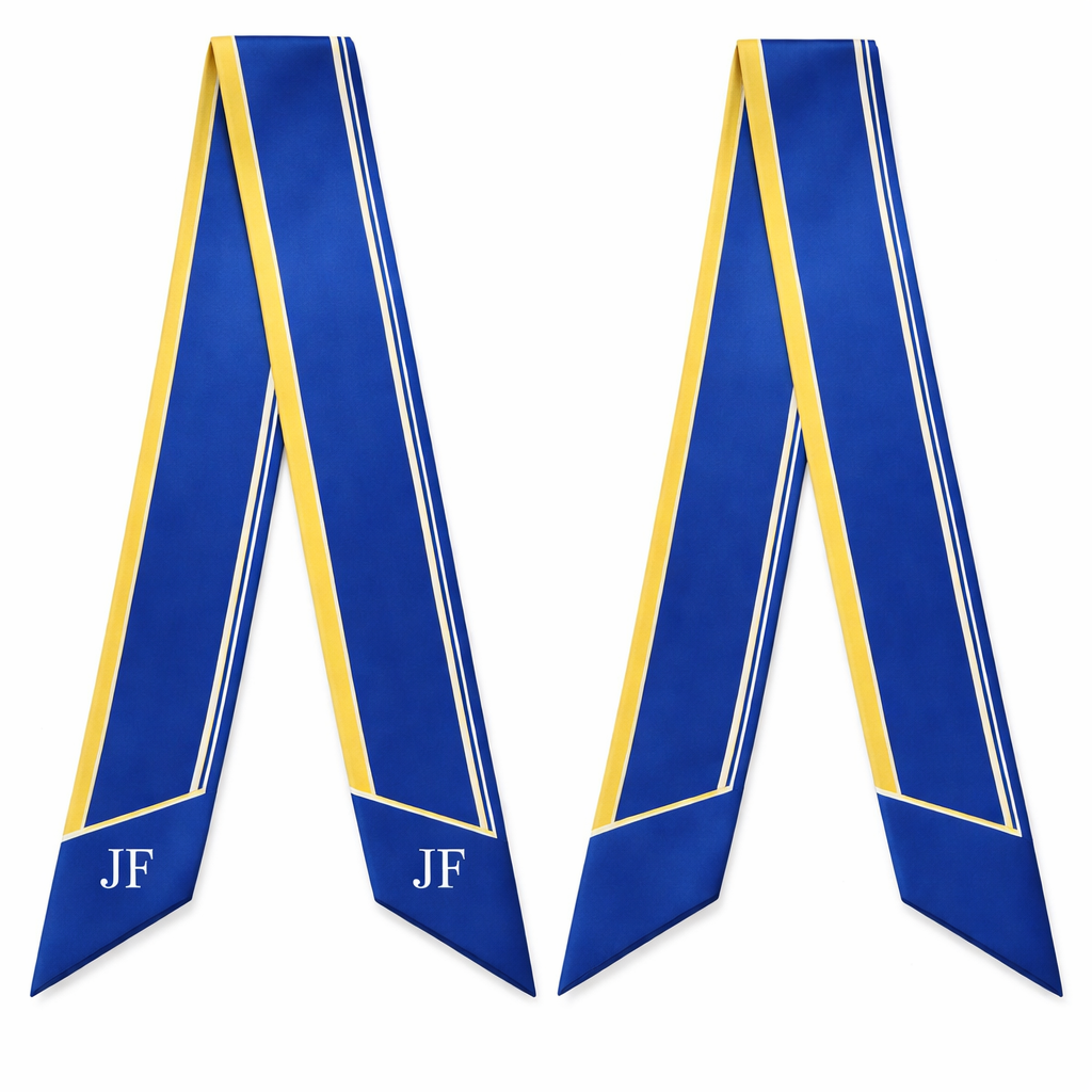 Design a twill scarf that is 5 x 86cm with oblique edges. Have it be mostly royal blue and yellow. Keep it super simple and tailored Add JF initial at the bottom, classic style, show front and back