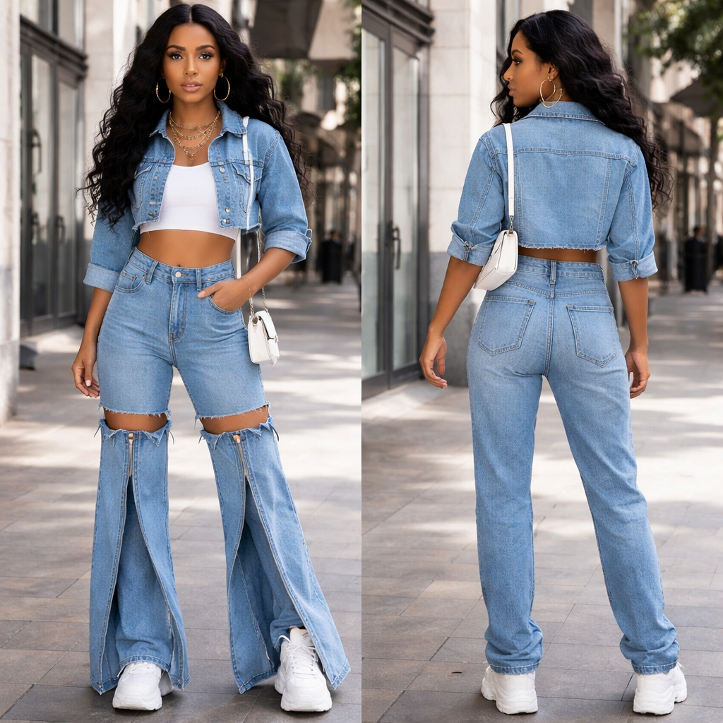 A denim two piece The trouser will be a detachable flare that makes it a trouser The second detachable piece makes it a straight boyfriend Jean The jacket is crop with collar and three quarter sleeves, streetwear style, show front and back