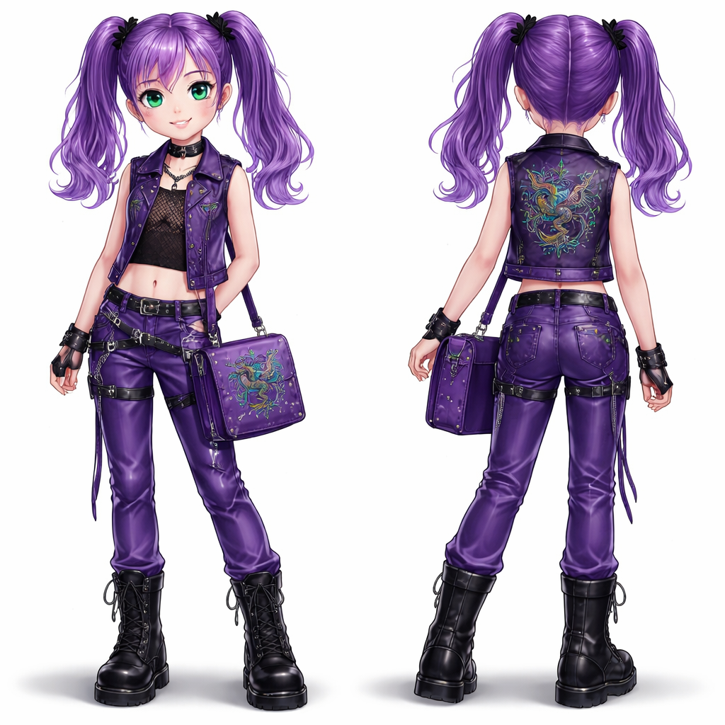 A girl with purple hair and green eyes and purple leather vest with a dragon on the back and purple leather pants black boots and a purple square bag with a dragon 10 years old , show front and back