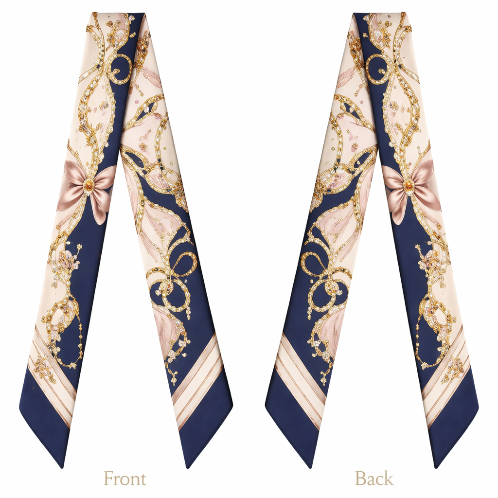 Design a scarf that is 5x86cm to be wrapped around the handle of a handbag for a lifestyle piece. No logos or words Something Blair Waldorf would wear to a cocktail hour, classic style, show front and back