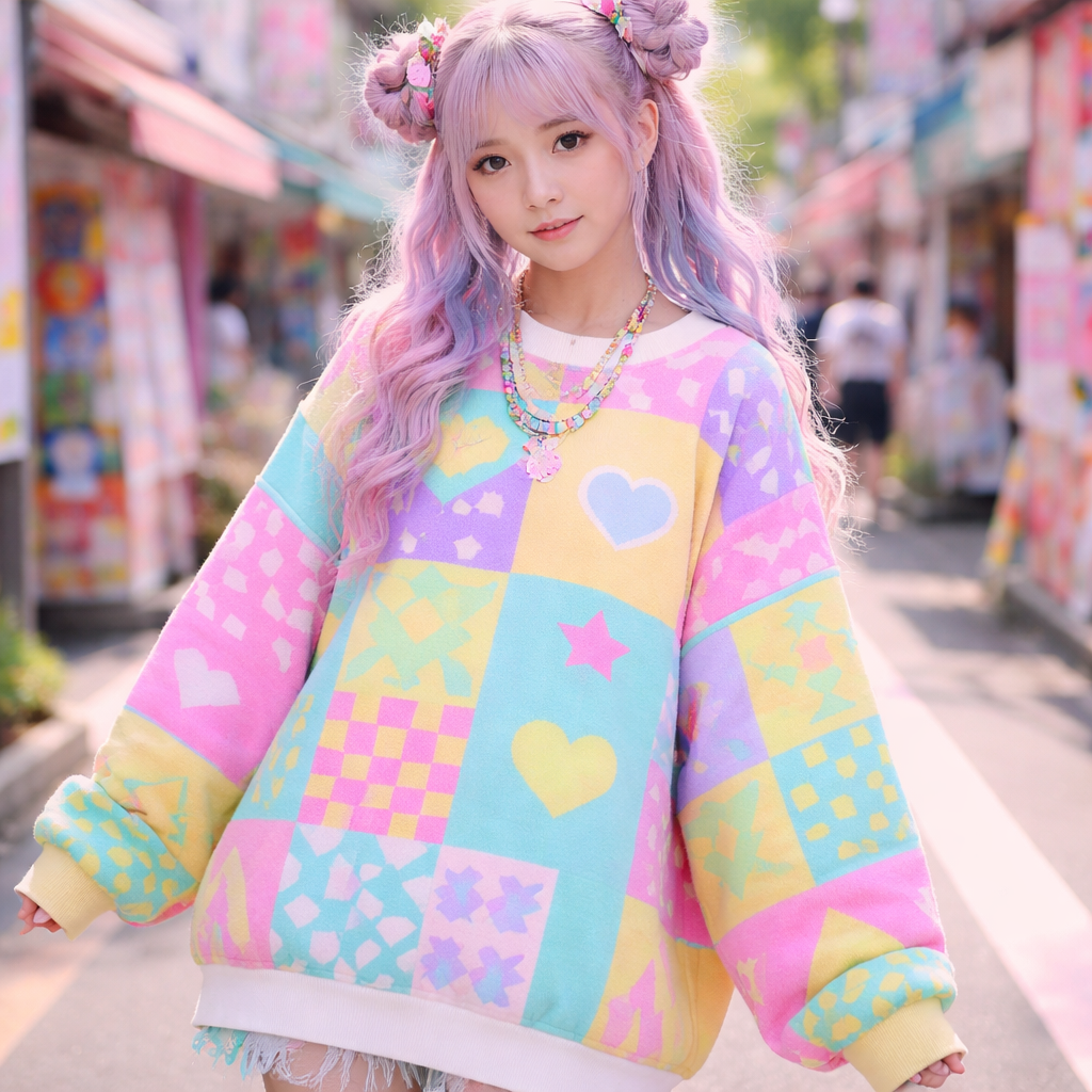 Japanese Street fashion design: Oversized cotton sweater, vibrant neon and pastel blocks, geometric patterns. Loose fit, playful and sweet, with a distinct Harajuku vibe.