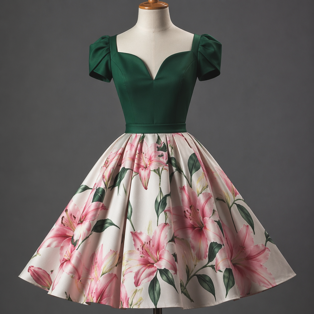 photorealistic fashion design, A Female Dress design. платье в стиле 50 годов, юбка полусолнце принт розовые лилии, лиф однотонный темно зеленый, короткий рукав. Russia fashion aesthetics., just the design no text. Refinement: необычный вырез, интересные рукова