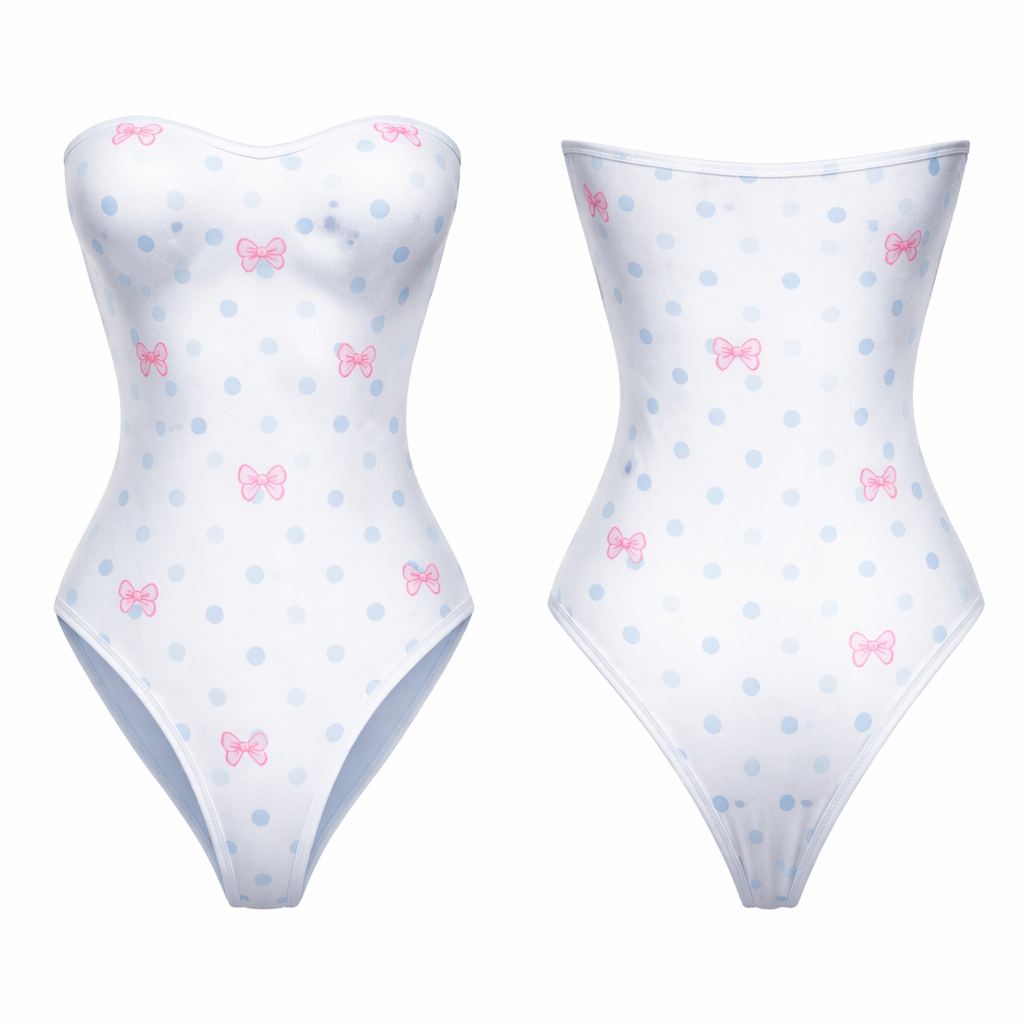 Bodysuit shape wear g string no ai model strapless no lines just no bow just string and no back open no ruffles blue white and light blue pocker dots with pink bow prints on