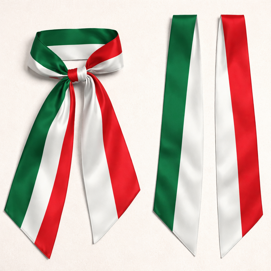 Design a silk twilly using the Mexican national flag. Keep it longitudinal stripes. With no logos jus the colors, classic style, show front and back