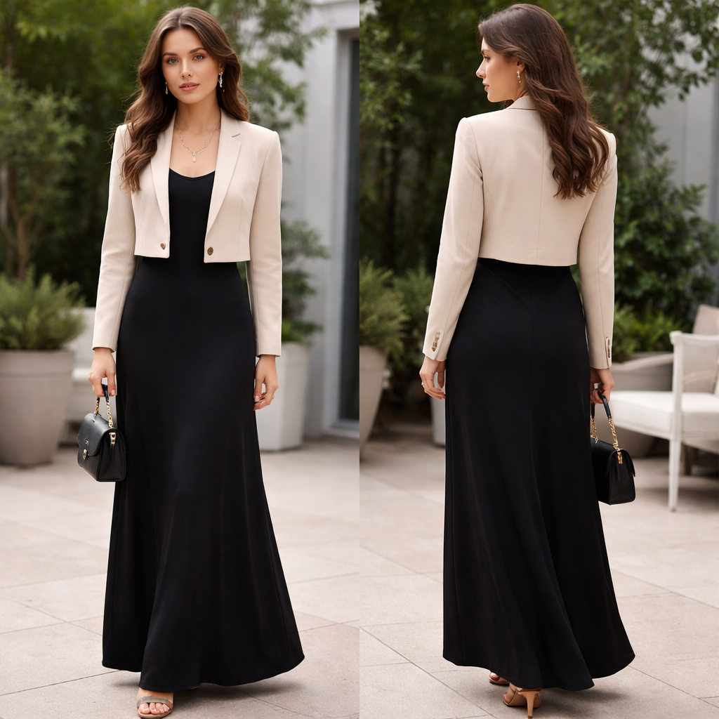 Elegant blazer and long black dress , casual style, show front and back