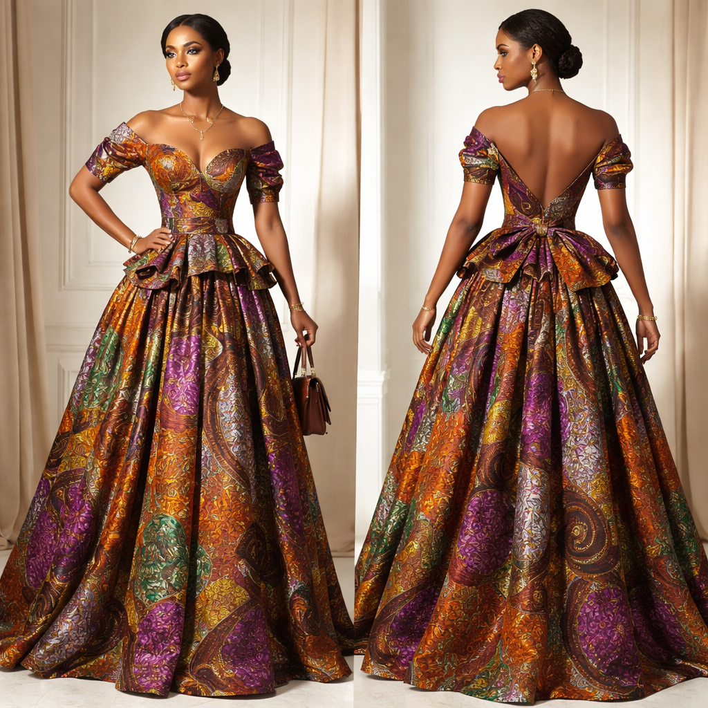 Je veux une robe rare, élégante, jamais vue, avec une touche couture classe avec pagne dampé il faut faire un design choc qu’on peut porter tout le temps même pour le boulot une sortie chic non je ne veux pas de robe plaqué je veux des robes ample faire le dos pas osé, show front and back
