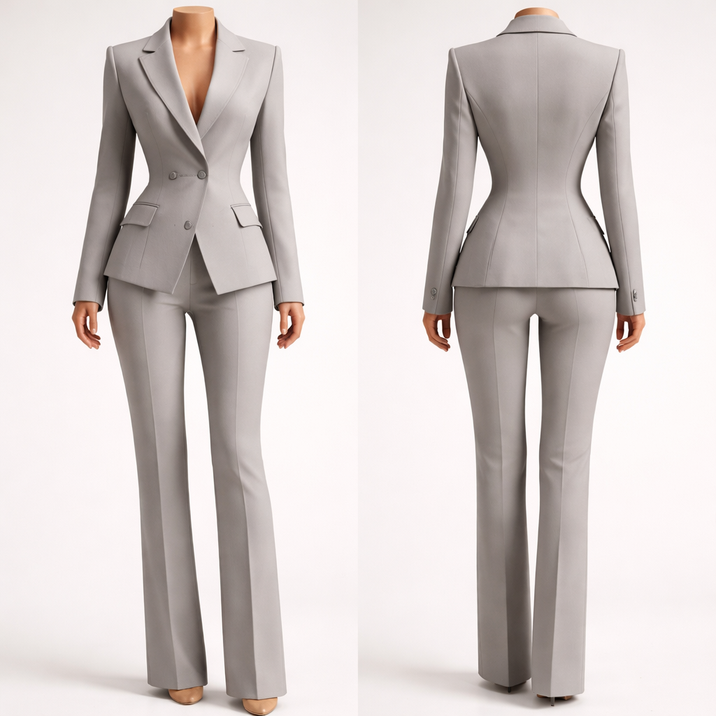 Create me an outfit with 72% polyester, 24% rayon, and spandex 4% 280 gsm. Suit 2 piece, show front and back