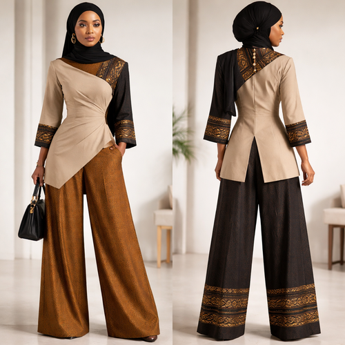 Crée un ensemble rare et luxueux composé d’un haut style boubou chic moderne avec un pantalon large élégant. Le haut doi...