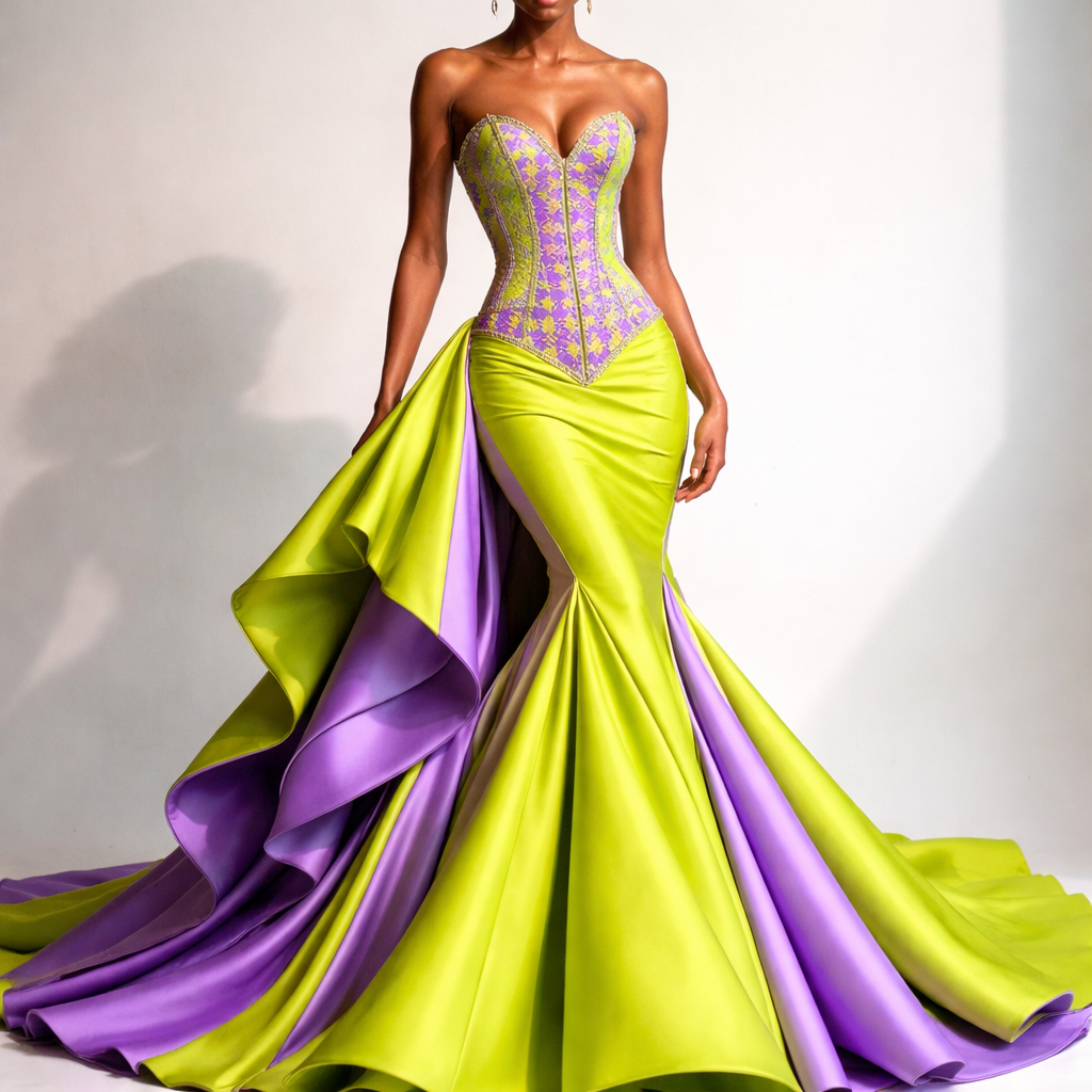 Create a high couture, ultra-luxurious kente corset gown designed with a striking and unconventional color palette. Use bright, rare, and unexpected colors such as electric lime green and vivid lavender (or other bold, uncommon pairings). The gown should feature a structured, sculpted corset bodice that accentuates the waist elegantly, with visible boning and a refined, regal silhouette. The corset should be made using a kente-inspired houndstooth pattern, created strictly from two bold colors only, ensuring the pattern looks graphic, clean, and fashion-forward. In contrast, incorporate a plain kente fabric (no patterns) in a single solid color, chosen directly from one of the two colors used in the houndstooth pattern, to maintain harmony and cohesion. This plain kente should be used for the skirt or draped elements of the gown. The skirt should be dramatic and couture-level—options include a mermaid silhouette, layered draping, or a voluminous sculptural flare with a train. Add high-fashion detailing such as: • Architectural pleating • Subtle beading or embroidery along seams • Luxurious fabric texture with depth and richness • Clean, precise finishing The overall look should feel editorial, runway-ready, and avant-garde, blending traditional kente heritage with modern haute couture design. The final result must look expensive, powerful, and globally high-fashion, suitable for a couture runway in Paris.