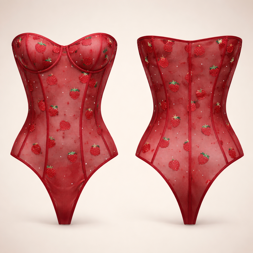 Bodysuit shape wear g string no ai model strapless no lines just no bow just string and no back open no ruffles strawberry