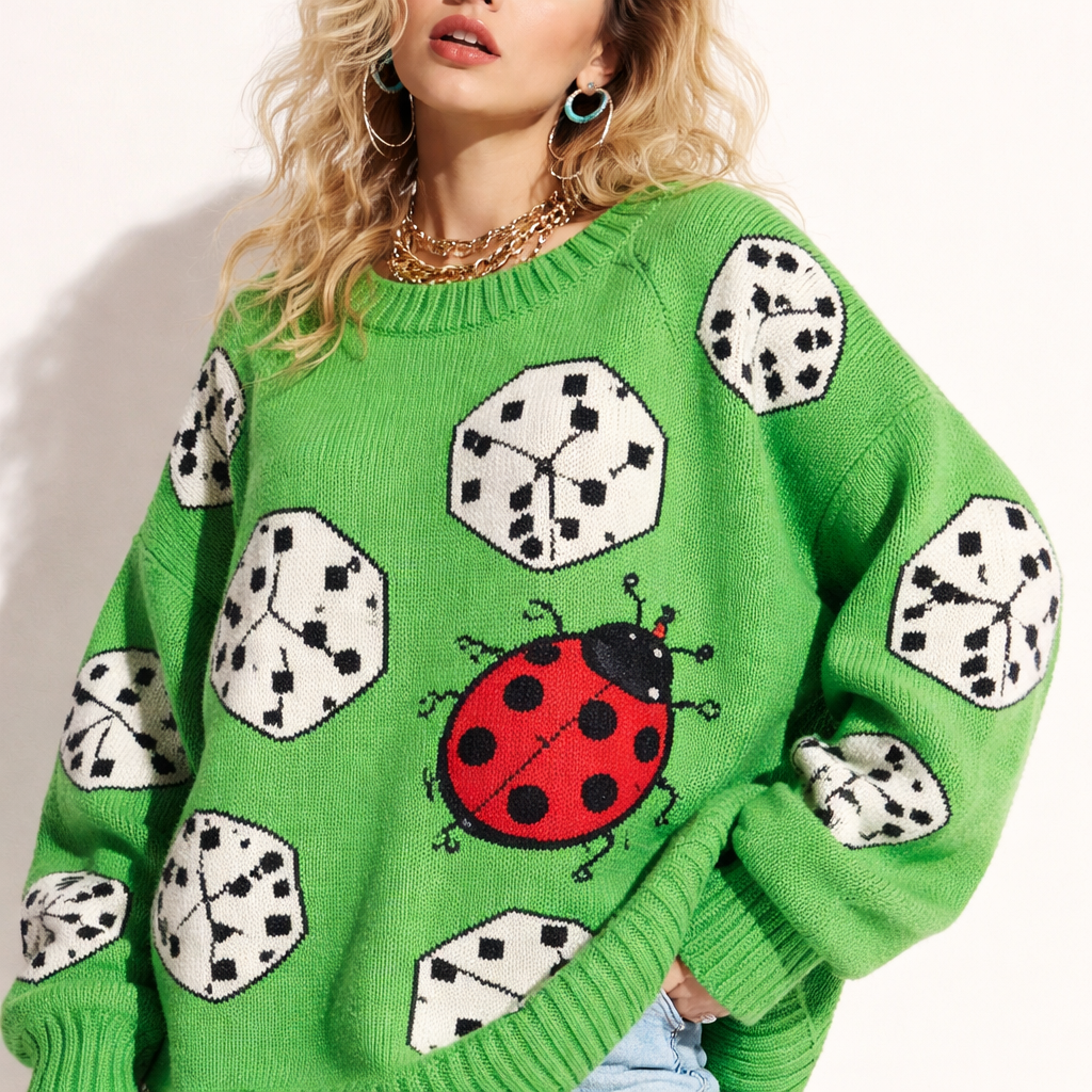 Eighties fashion design: A bright green oversized chunky sweater knit, with black and white dice pattern all over, one die features a big cute red ladybug, dropped shoulder, relaxed fit.
