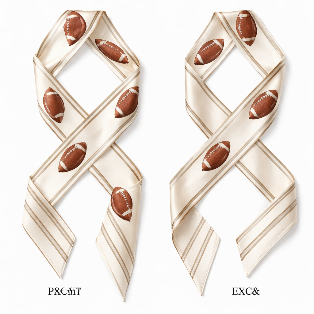 Design a silk scarf thanks 5x 86cm to be wrapped on the handle of a purse. No logos or any school relation but a collegiate feel. Make it footballs . Way more simple and tailored just football Ivory with feminine sporty touch without being sweet