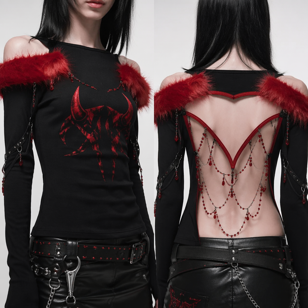 A Female Top design, in Emo style. чёрный на нём красный мех и нарисованы рожки зади вырез крыльев который оточён красным мини цепочки на которорх красные бусины. Poland fashion aesthetics.