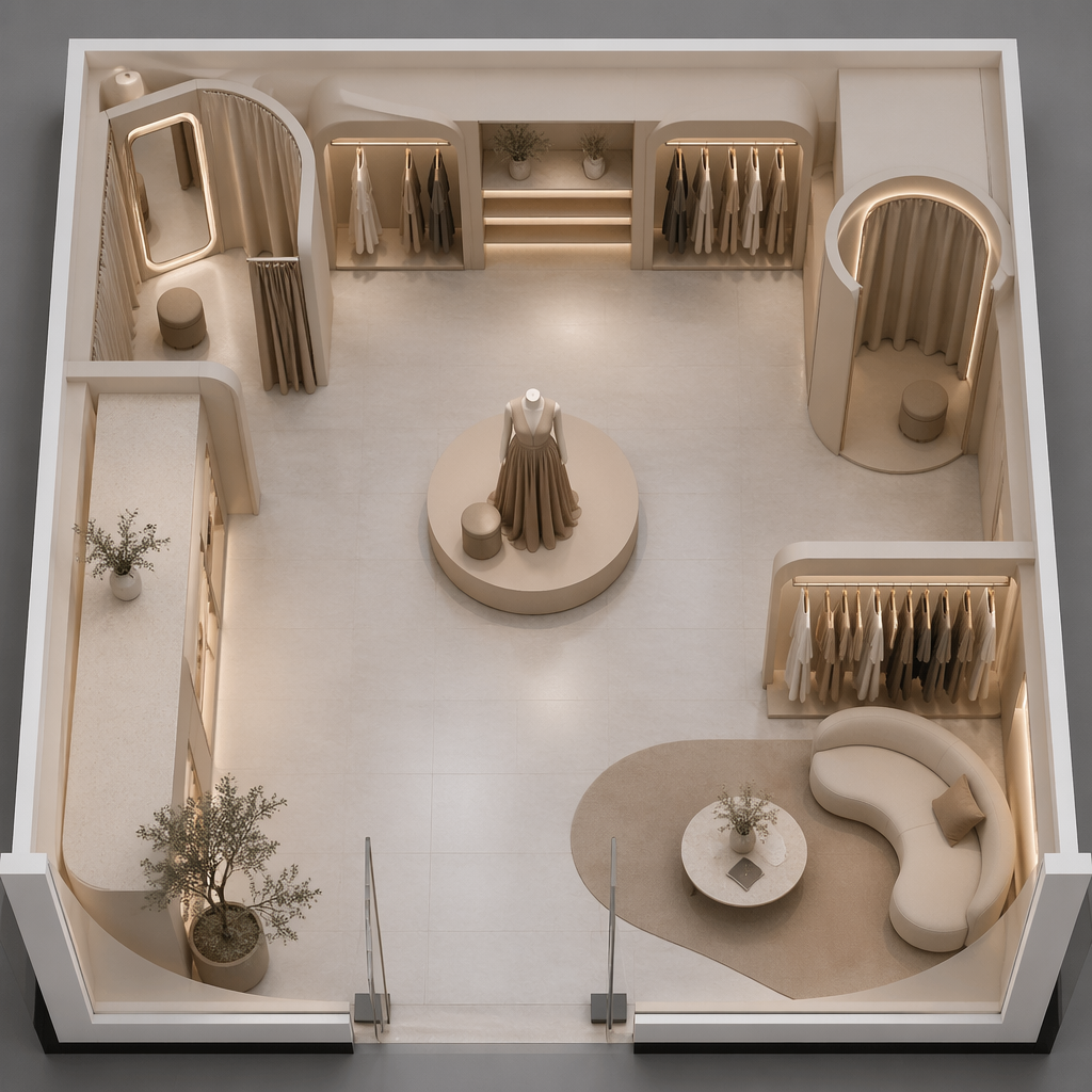 A Female Dress design, suitable for Spring. Fitting area Photo booth Drawers Hanging gowns area Waiting area Shop is 470 sqft. UAE fashion aesthetics.