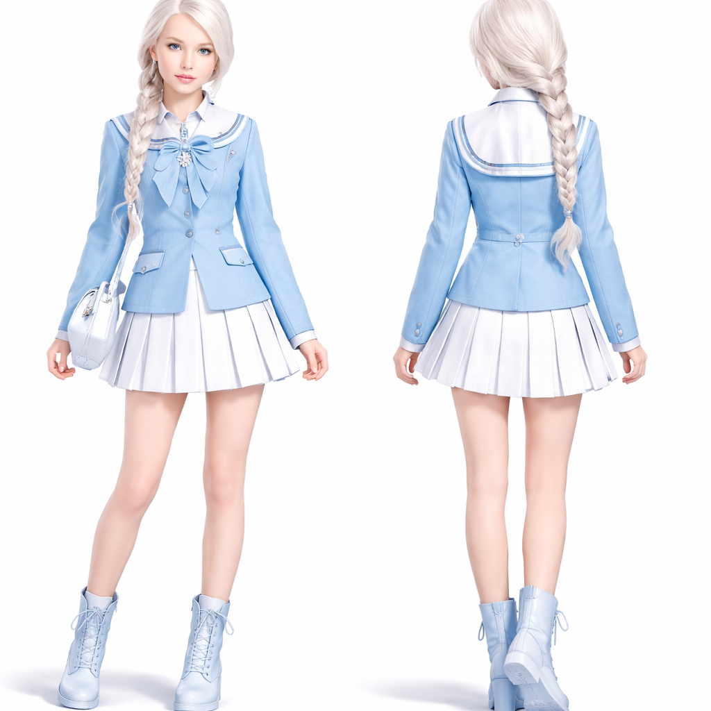 A 18 year old teenage girl with a Scandinavian face and white hair with one braid wears ice blue blazer with a white skirt and ice shoes , school_uniform style, show front and back