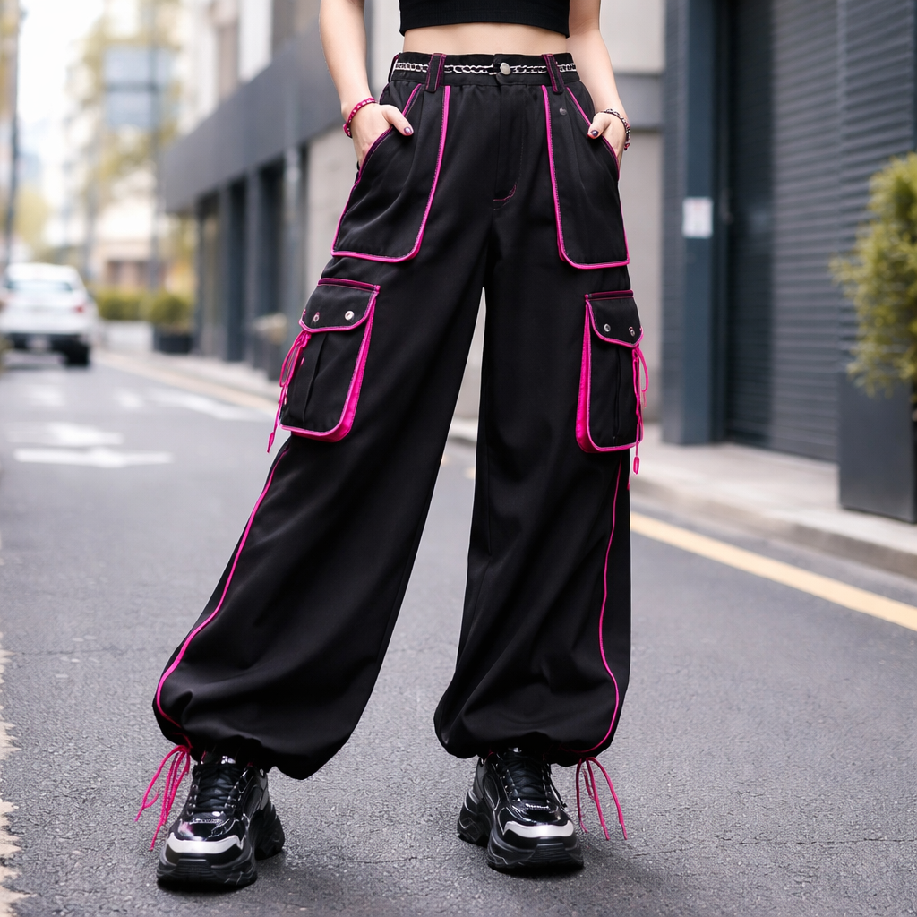 Korean Fashion fashion design: Black cotton wide-leg cargo pants with hot pink trim, high-waisted, relaxed fit, street style.