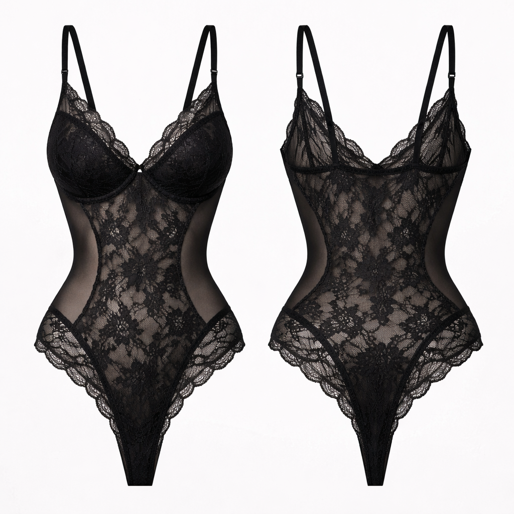 Shape wear no ai model all cotton seamless g string body suit mesh black bodysuit lacy all over lace , classic style, show front and back
