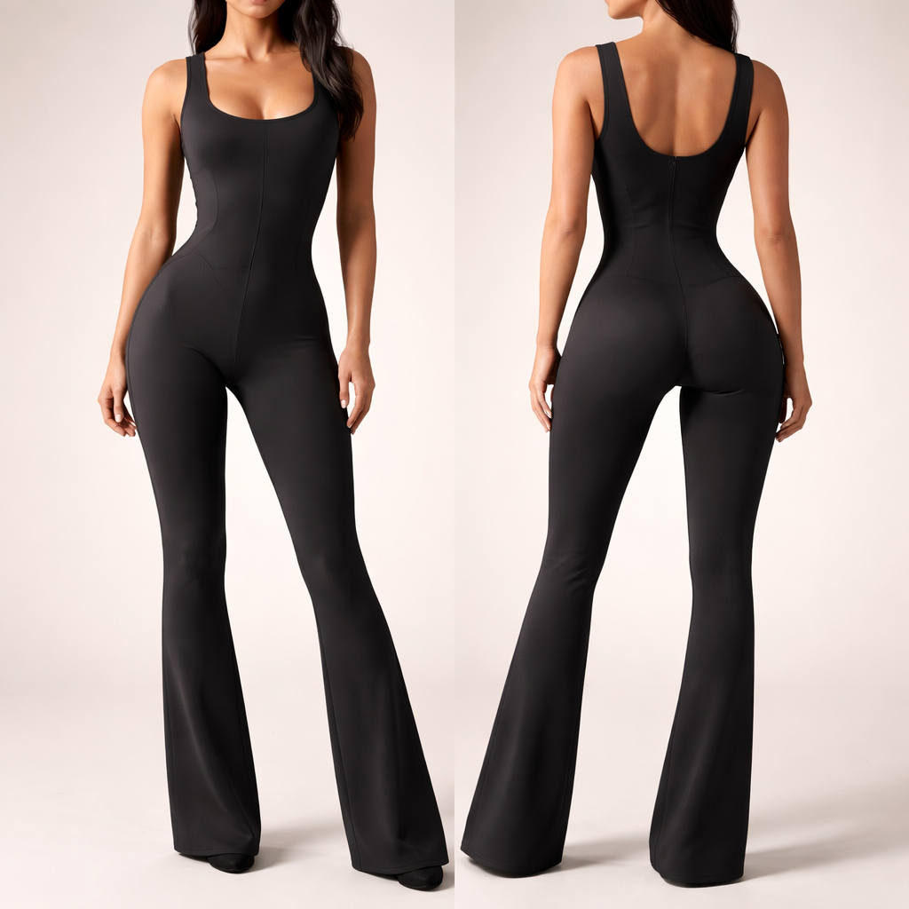 Ultra-realistic fashion design render of a women’s sculpting flare jumpsuit with completely invisible built-in shapewear...