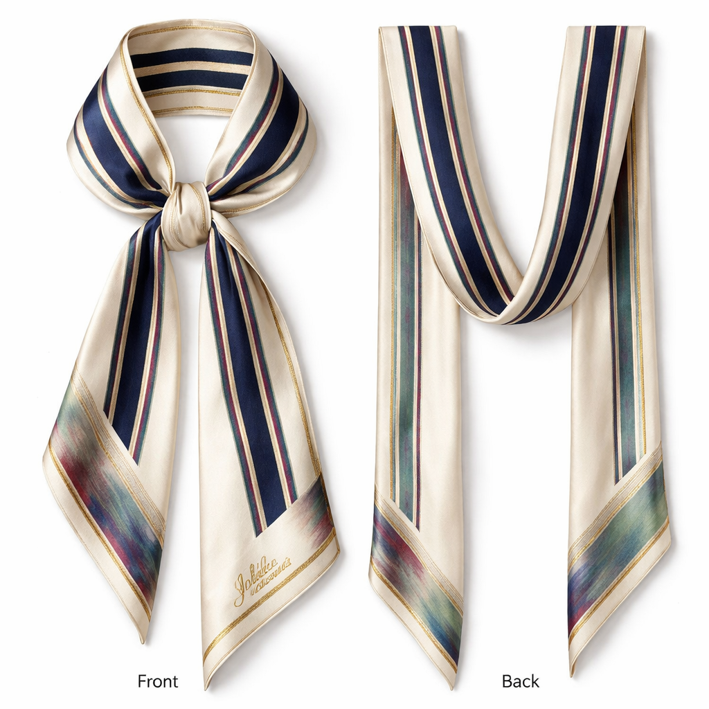 Design a 5cm x 86cm silk twill scarf for Jolie Franc, blending American preppy structure with British tailoring and a subtle feminine touch. This scarf is for evening outings. Feature narrow, structured stripes in deep navy and slate blue. Include subtle painterly accents along the edges in muted burgundy, soft emerald, and antique gold to catch soft evening light. Base color: warm ivory or cream. Add a thin framed border and hand-rolled edges. The design should be polished, timeless, and instantly recognizable when wrapped around a Kelly-style bag handle or worn for sophisticated evening wear., classic style, show front and back
