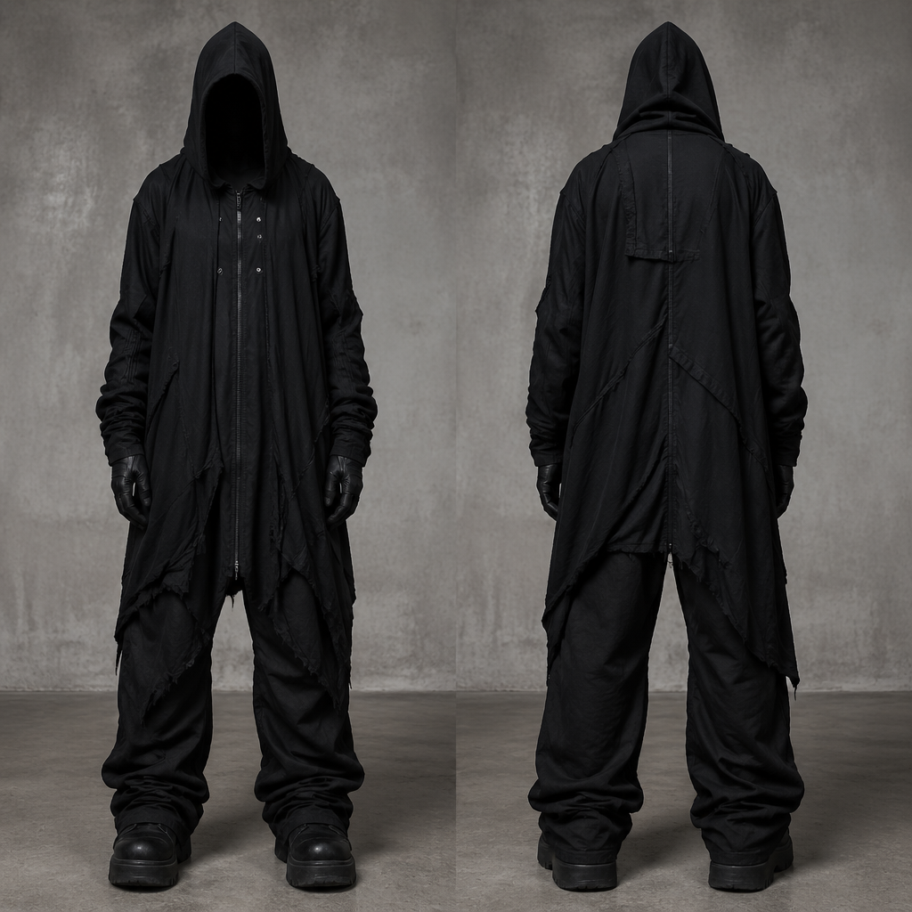 photorealistic fashion design, Muy negro rick Owens Balenciaga , grunge style, just the design no text, show front and back
