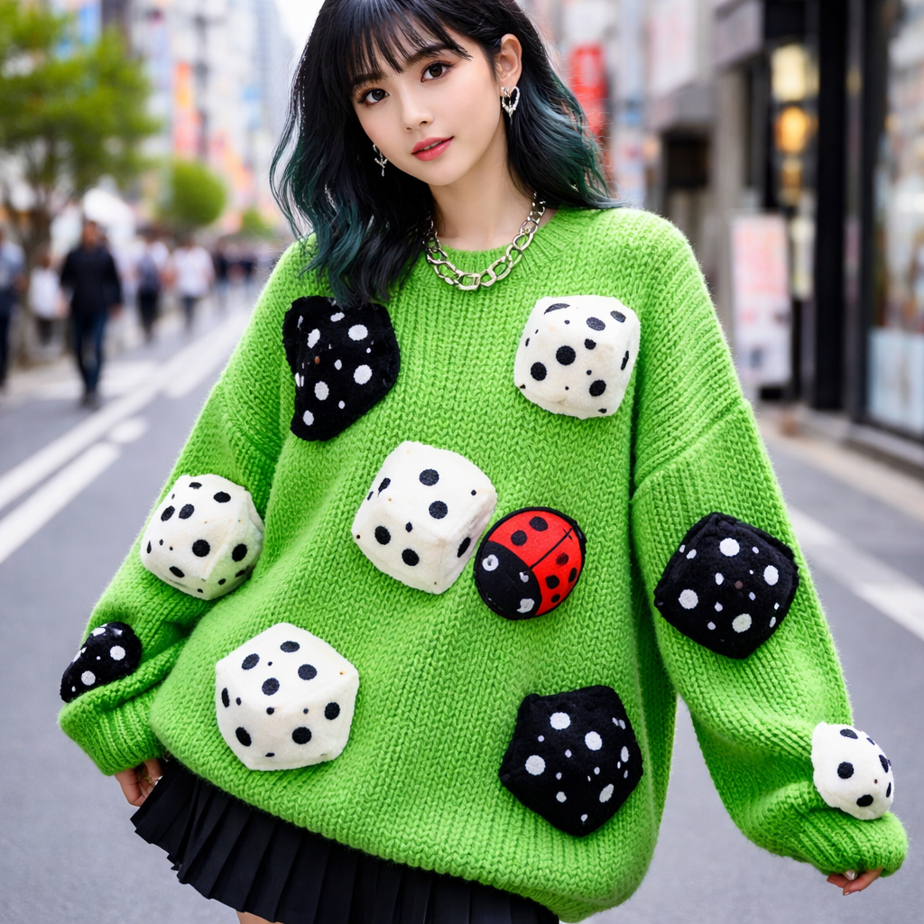 Japanese Street fashion design: Japanese Street Style: Oversized bright green chunky knit sweater, scattered with large black and white dice. One die face is a cute red ladybug. Relaxed fit.