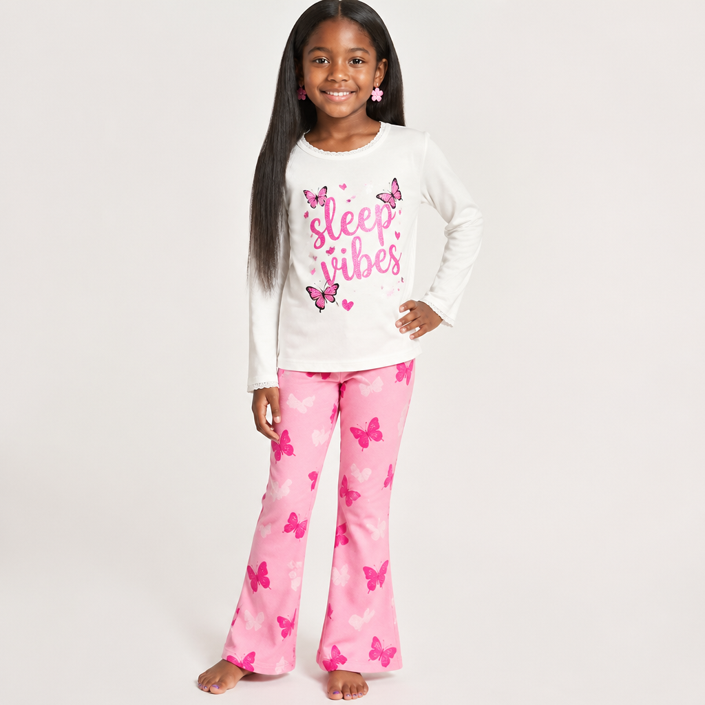 photorealistic fashion design, A black skin 9 years old with a straight hair painted purple toe nails and flower earrings and a white pajama shirt that says sleep vibes with butterflies and pink flare pajama pants with hot pink butterflies girl shirt says sleep vibes straight hair paint purple toenails flowers earrings super young looking but 9 years old shirt says sleep vibes black hair all over , sleepwear style, just the design no text