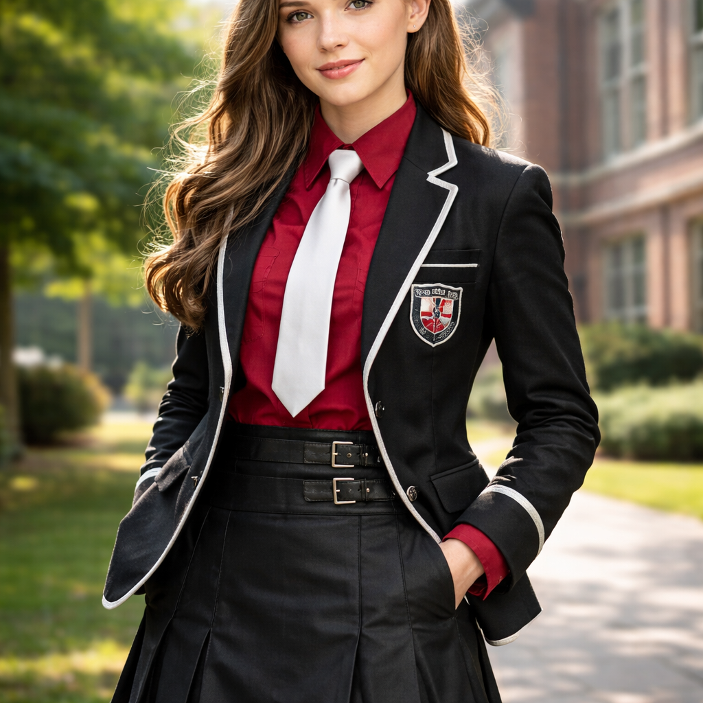 Black school blazer with silver piping. A black waxed cotton kilt with minimal pleats. School cap Red shits. White tie.