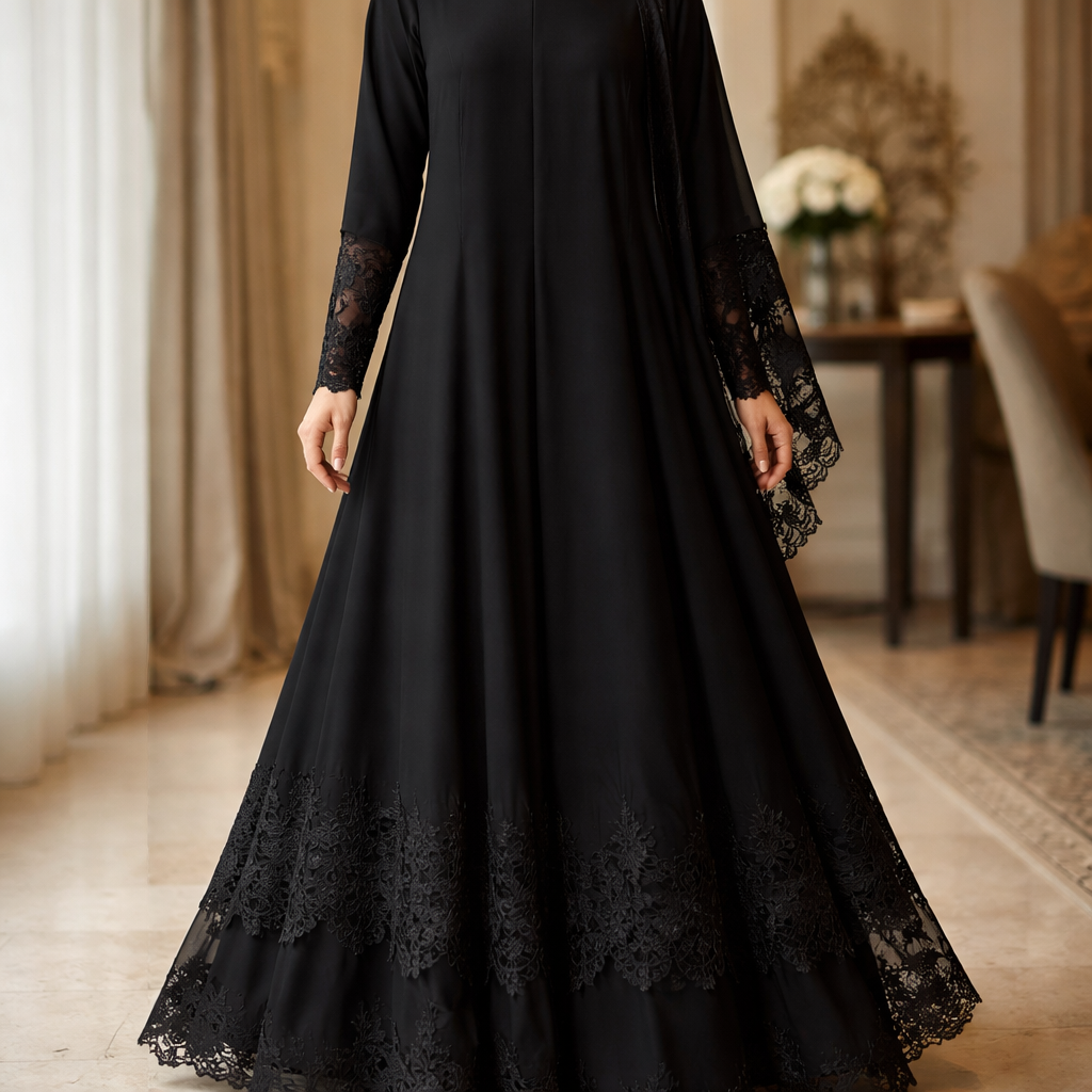 صمم لي عباية اسود نص كلوش باكمام ضيقة دانتيل ومن الاسفل دانتيل