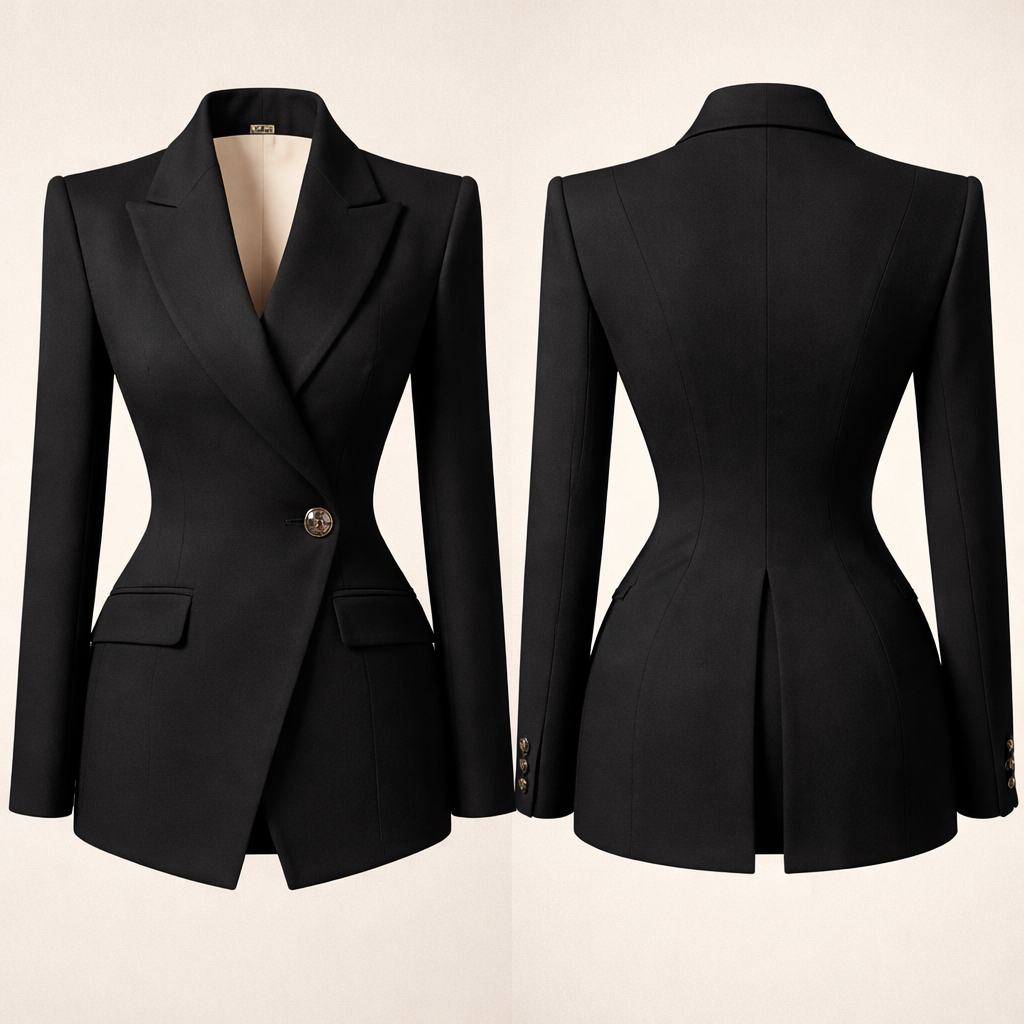 A structured, tailored women’s blazer designed to embody quiet power, elegance, and authority. The silhouette features strong, defined shoulders with a sculpted, cinched waist that enhances the natural figure. The fit should be sharp and precise, creating a commanding yet feminine shape. The blazer includes an asymmetrical wrap-style front with a deep V neckline and a single statement button at the waist. The lapel is clean and slightly exaggerated, with a smooth, refined curve. The overall design is minimal but striking, with architectural lines that create a bold presence without excess detail. Fabric should be a mid-weight structured stretch suiting material that holds its shape while allowing comfort and movement. Color: Black with subtle contrast detailing if needed. Lining: Nude or champagne tone for a soft luxury finish. The blazer should feel powerful, polished, and effortless—designed for a woman who commands attention without speaking., classic style, show front and back