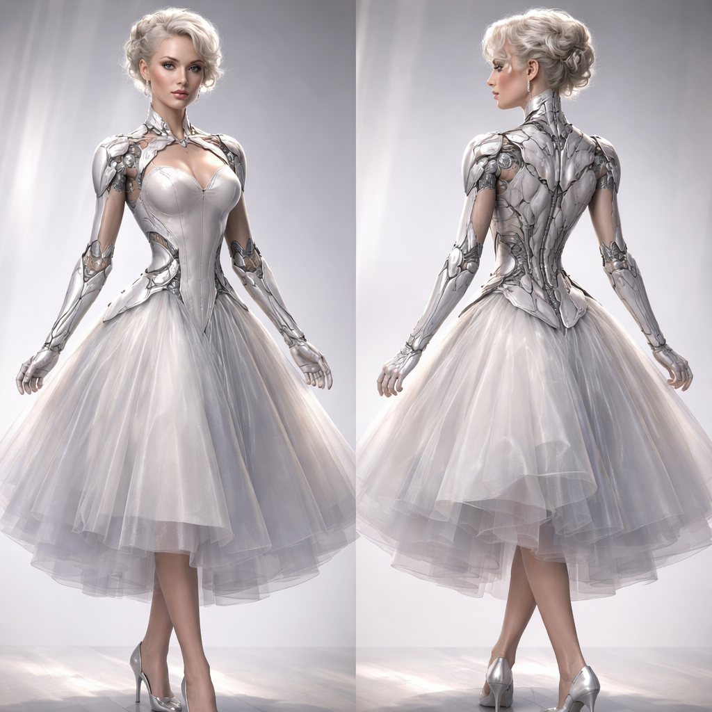 Trend: future armour Layered torso silhouette, blending organic curves with mechanical hinge joints: shows soft armour. She wears a tea dress. More structure and soft power , fifties style, show front and back