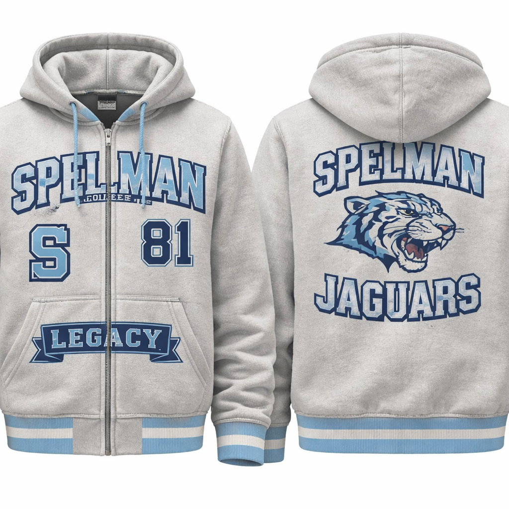 Design a new hoodie like the one on this page https://www.dtlr.com/products/for-the-fan-howard-university-the-mecca-honor-full-zip-fleece-hoodie-ma-navy-how-1867-301-2a-nay Take out the Mecca change the jaguar to the spelman college Switch out 67 for 81, add the S patch for Spelman design a new hoodie using the following details remove the H patch, change the strings on the hoodie to baby blue and the sweatshirt to a grey color and on the back add the spelman jaguars logo as the previous style Change honor to legacy