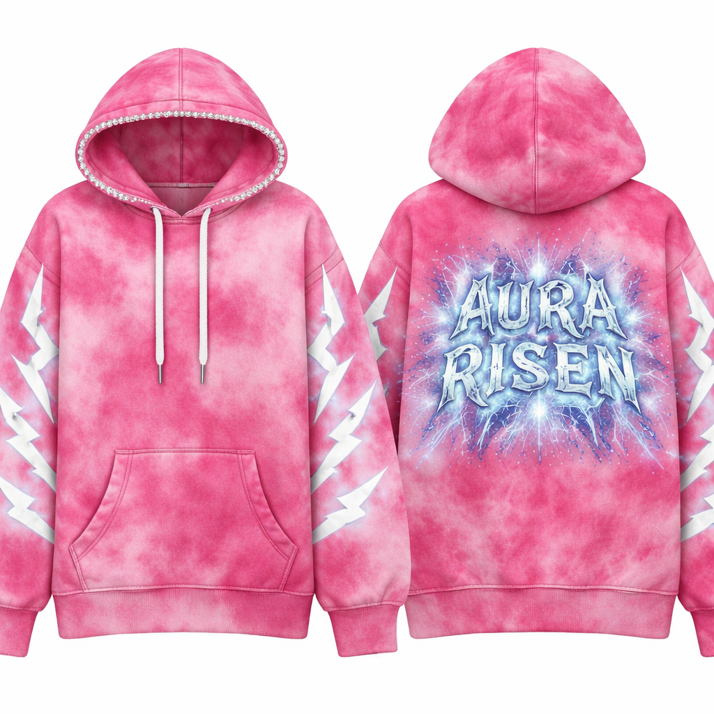 Acid wash pink hoodie with 3d white lightning on the arms. With white rhinestones going around the edge of the hood. The back has a print that says AURA RISEN , show front and back