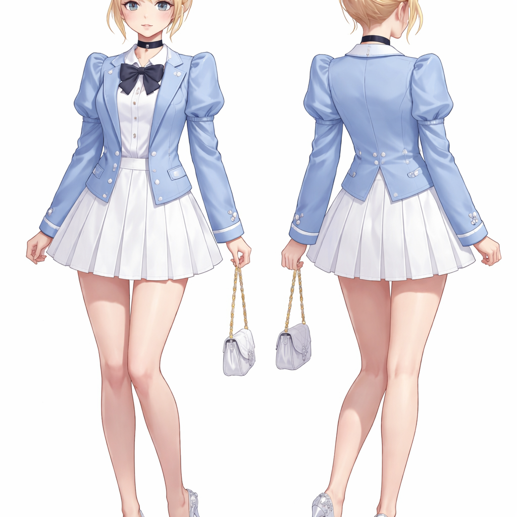 A girl with blond hair in a bun wears a light blue blazer with puff sleeves and a white skirt with glass shoes and has a black choker necklace , school_uniform style, show front and back