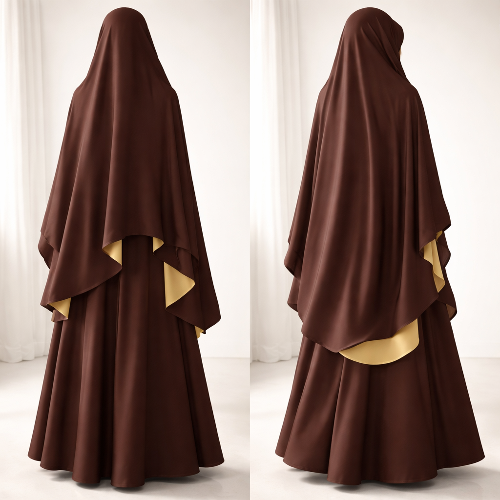 A modest fashion outfit featuring a WAHA reversible set composed of a khimar and a long skirt, shown on a mannequin or model. The outfit must be clearly reversible, but without any visible contrasting borders or edges. โข The outside of the outfit is entirely chocolate brown (uniform color, no yellow visible on the edges). โข The inside lining is butter yellow, and this inner color is revealed naturally through movement, folds, or slight openings of the fabric, both in the front and in the back. The khimar is sleeveless, loose and flowing, and falls to the front of the knees. It should have a clean, minimal cut with no sleeves or arm shaping. The skirt is long, wide and flowing, fully modest. The model is shown front and back (two views) to clearly demonstrate the reversible concept. The fabric should be slightly lifted or layered to subtly reveal the butter yellow inner side, without creating artificial borders. Important: the feet must not be visible (cropped above the ankles or fully covered). Style: minimalist, clean, modest fashion aesthetic, soft natural lighting, high-quality fabric, smooth draping, elegant and realistic. โธป ๐ก Si tu veux un rendu encore plus propre, tu peux ajouter : no contrast trim, no visible lining edges, only natural inner fabric revealed through folds