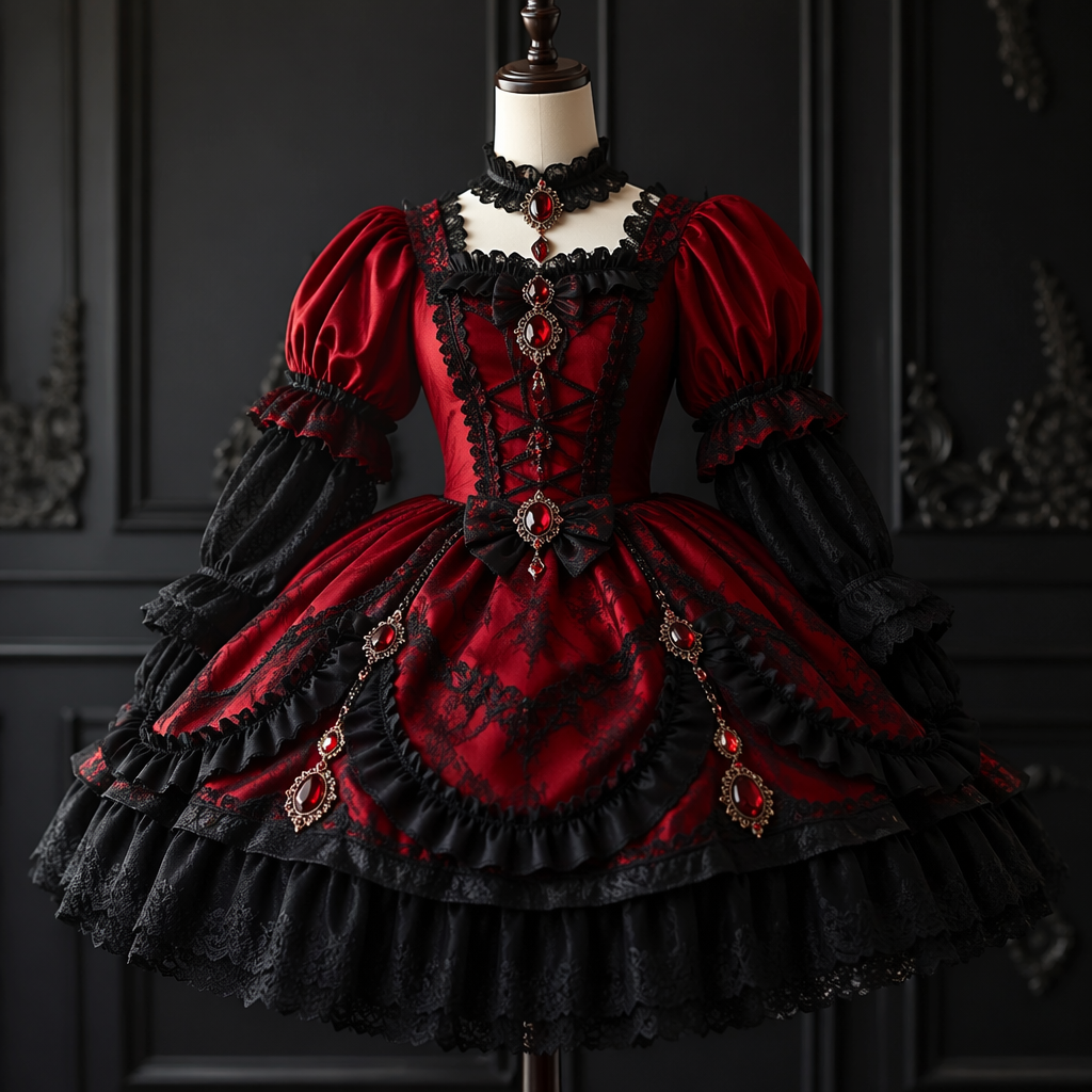 A Female Dress design, suitable for Spring, in Lolita style. красное платье с чёрной фотой и и украшена и рубинами. Poland fashion aesthetics.