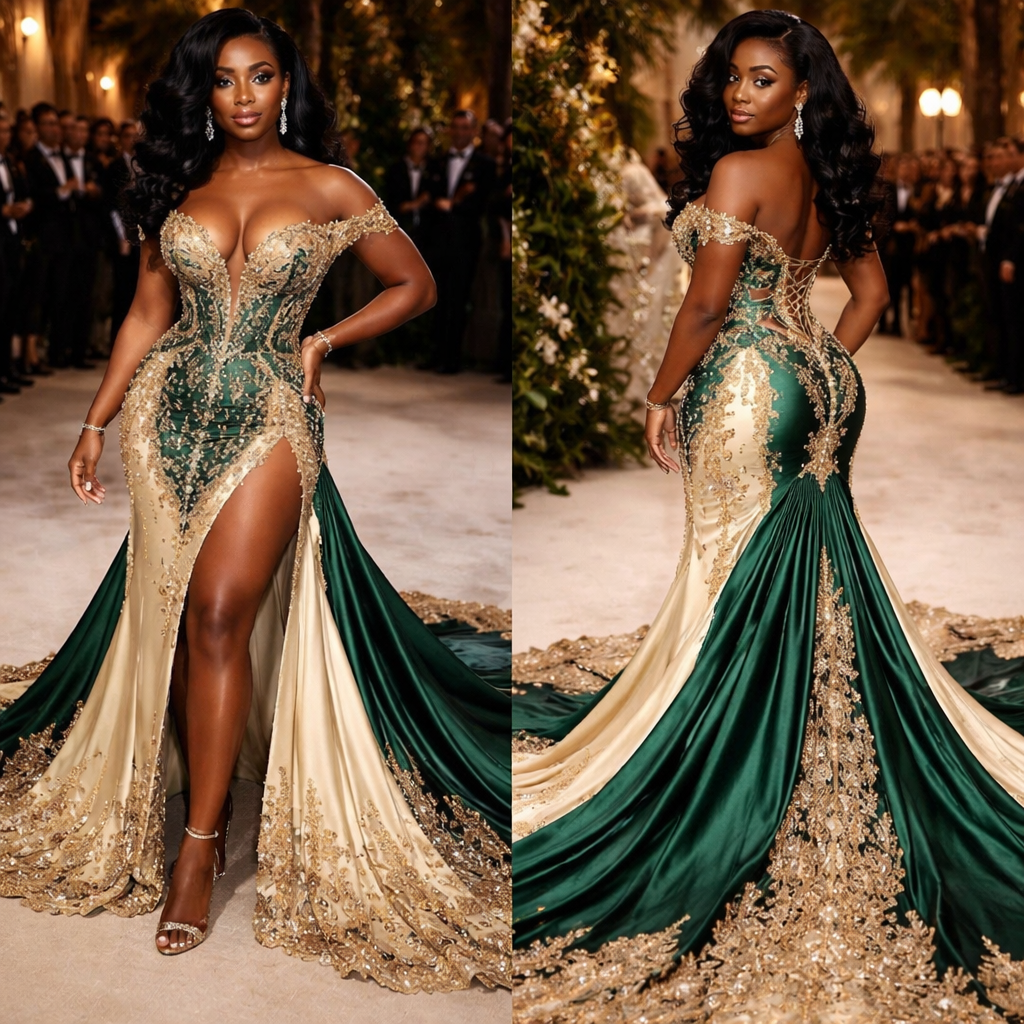Dress for a premier with emerald greengold and cream with a long train fitted corset bodice lace accents gold detailing low cut bodice More dramatic ( for a short black woman very curvy , show front and back